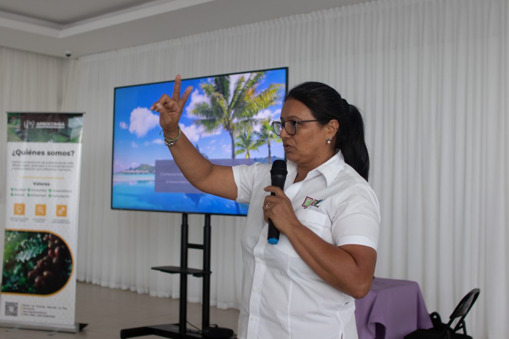 Posteriormente, la Ing. Sonia Vásquez presentó las nuevas regulaciones de la Unión Europea y su impacto en la cadena productiva, haciendo énfasis en los retos y adaptaciones que organizaciones como APROCOMSA deben considerar.